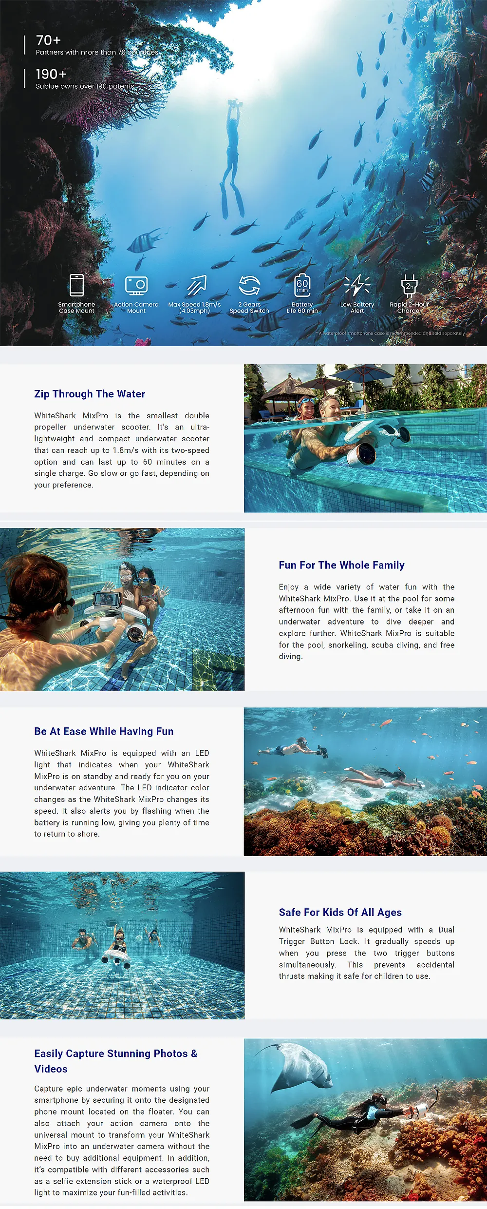 Make your underwater exploration easier with the WhiteShark MixPro – the smallest double propeller underwater scooter on the market. WhiteShark MixPro is ultra-lightweight and compact. It can reach up to 4 mph and lasts up to 60 minutes on a single charge.
